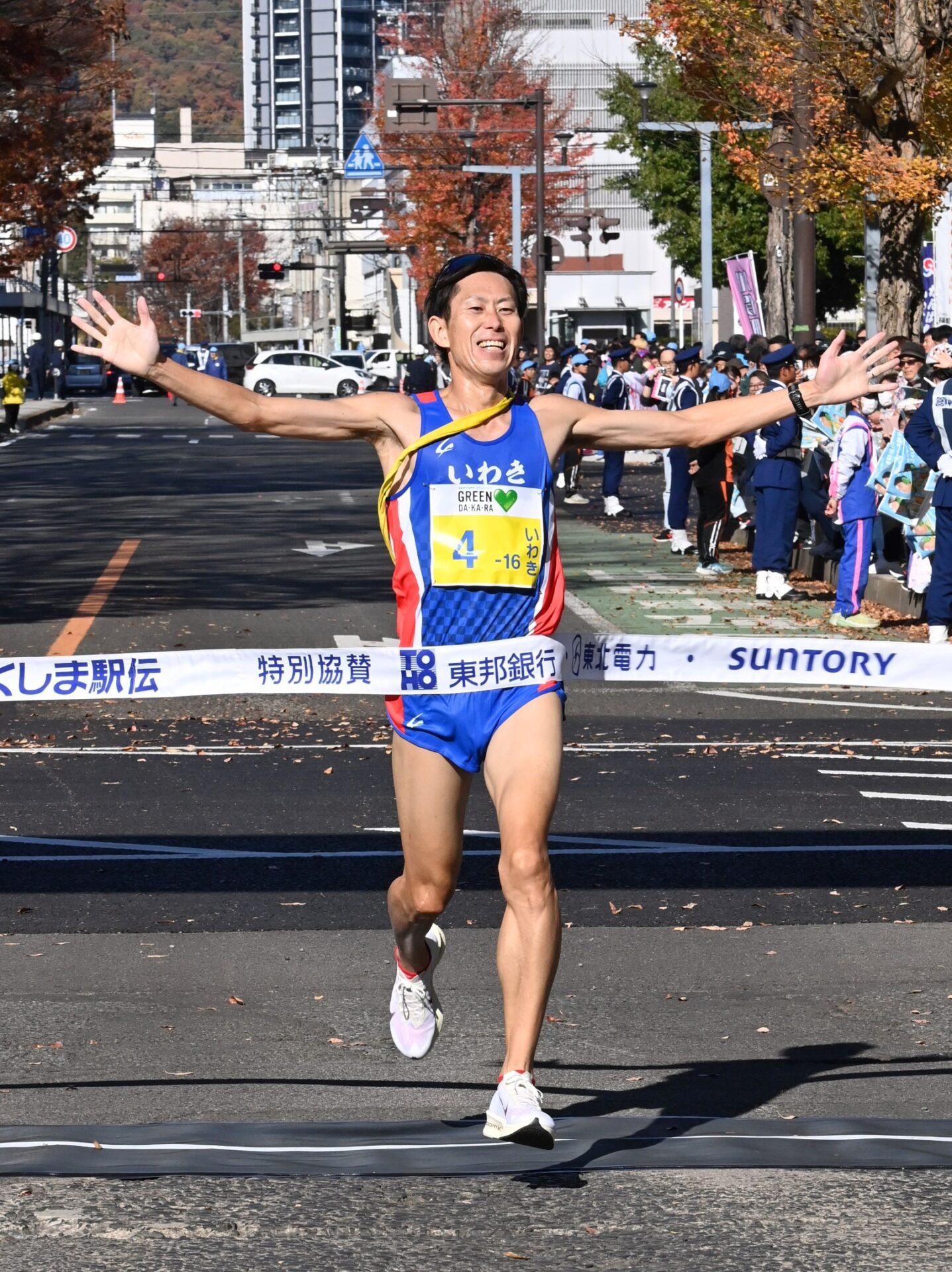 いわき市は総合6位でタスキを受けた3区富岡晃世選手(22)=国士舘大4年=が区間賞の走りで、首位に躍り出た。その後は一度もトップを譲らず、アンカー村上康則選手(41)=富士通=がフィニッシュ。郡山市に3秒差で敗れた昨年の悔しさを晴らした。4時間59分45秒は、現行コースとなった2023(令和5)年以降で最速のため大会新記録として扱う。